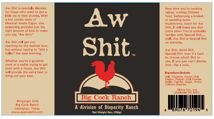 Hot n' Spicy, specially blended for those who want a little heat in the cooking. This is just what the doctor ordered, the taste is Mexican meets Cajun. This shit seasoning provides just the right amount of kick to make you say "Aw Shit!". You won't find this in your local grocery market. This is a special product, and the spiciest of the Shit seasonings. Aw Shit will get you reaching for the nearest beer, but without having to "bite the bullet" the next morning.